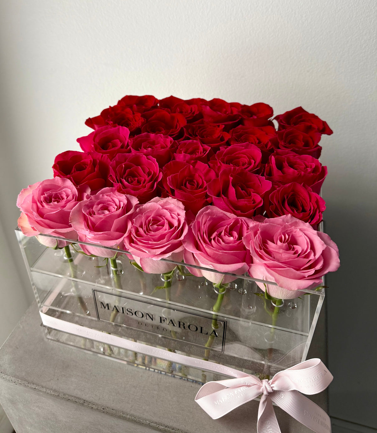 Introducing our Love Ombre La Glace Collection beautifully crafted in our signature acrylic box. Designed to celebrate every kind of love, this stunning arrangement makes the perfect gift for your mom, daughter, sister—or a little self-love moment (because you deserve it, too!) 💕 This gorgeous box contains 12-25 luscious FRESH roses that follow the rim of the acrylic box. As always, hand crafted with love and care.